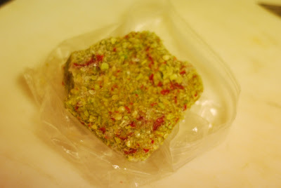 I know, it sounds so arrogant, but I never follow recipes, I just take inspiration from them, and besides, my cooking is almost always driven by making use of what I have on hand, so I was neither inclined nor prepared to follow any of Keller's recipes precisely. But, I was ready to follow his general scheme, the main ingredient is usually stacked on top of a portion of some complementary (not complimentary) side, a vegetable preparation, I didn't have any of the things he uses in his recipes,so I took stock of what I had, and here is what I came up with: Lima beans. I had lima beans, I had red peppers, I had scallions, and some red pepper coulis sauce, leftover from something I made yesterday that I will blog tomorrow. And I had this, its something you can find in asian markets, you can buy frozen blocks of chopped lemongrass, either with or without hot chilis in it, its the greatest thing, any dish that calls for lemongrass, you pull this block of frozen chopped lemongrass out of the freezer, chop of a hunk,you are golden. This one has the hot chilis, I thought this would add that little something different: